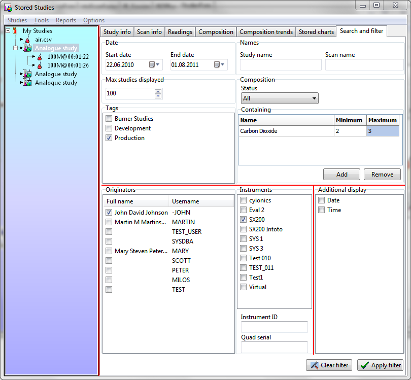 This is the stored study search window. User can configure the filter options and search for matching stored studies.